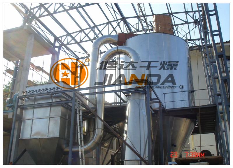 系統工作原理:空氣經過濾和加熱,進入干燥器頂部空氣分配器,熱空氣呈螺旋狀均勻地進入干燥室。料液經塔體頂部的高速離心霧化器,(旋轉)噴霧成極細微的霧狀液珠,與熱空氣并流接觸在極短的時間內可干燥為成品。成品連續地由干燥塔底部和旋風分離器中輸出,廢氣由風機排空。