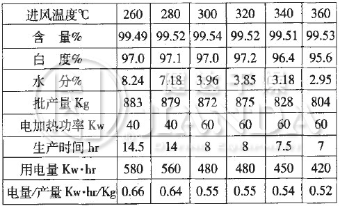 我們進(jìn)行了分組試驗,取相同的樣本量,不同的進(jìn)風(fēng)溫度進(jìn)行試驗。其中進(jìn)風(fēng)溫度分布為:260℃、280℃、300℃、320℃、340℃、以及360℃。樣本的含水量14.05%,白度為96%。出風(fēng)溫度設(shè)定為95-105℃。